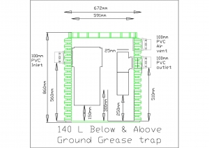 A 140 litre grease trap is supplied as standard to remove food scraps and grease from kitchen waste water. 300L grease traps are also available for larger households. Some councils insist on large grease traps to extend the life of the trenches.